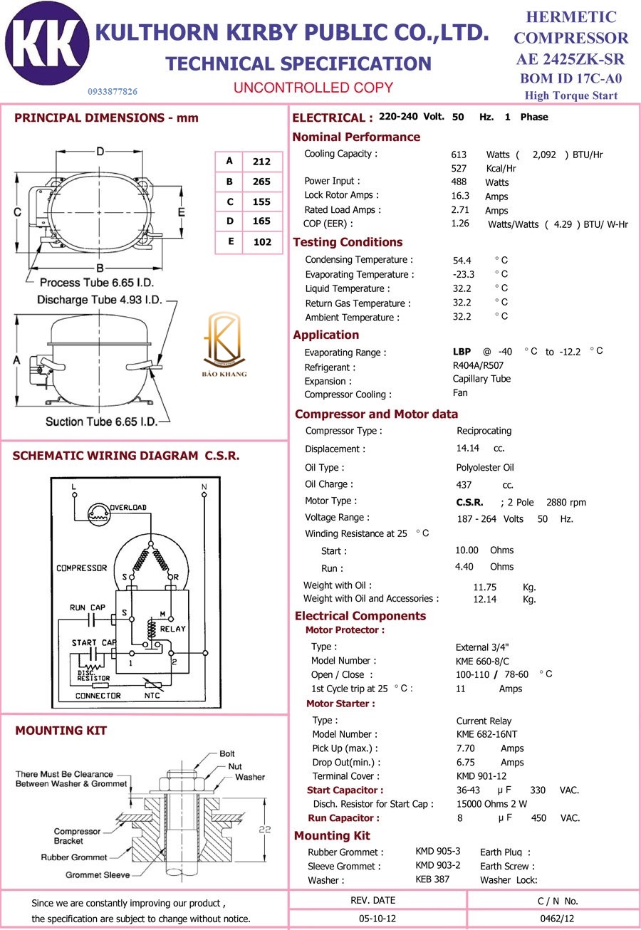 Tên sản phẩm: Máy nén Kulthorn Model: AE2425ZK-SR ; Công suất: 5/8HP; Điện áp: 380V-420V/50HZ; Gas: R404; Xuất xứ: Thái Lan