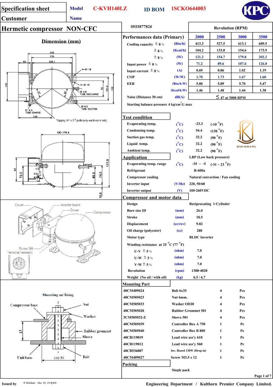 Tên sản phẩm: Máy nén Kulthorn Model: C-KVH140LZ Gas: R600A;
