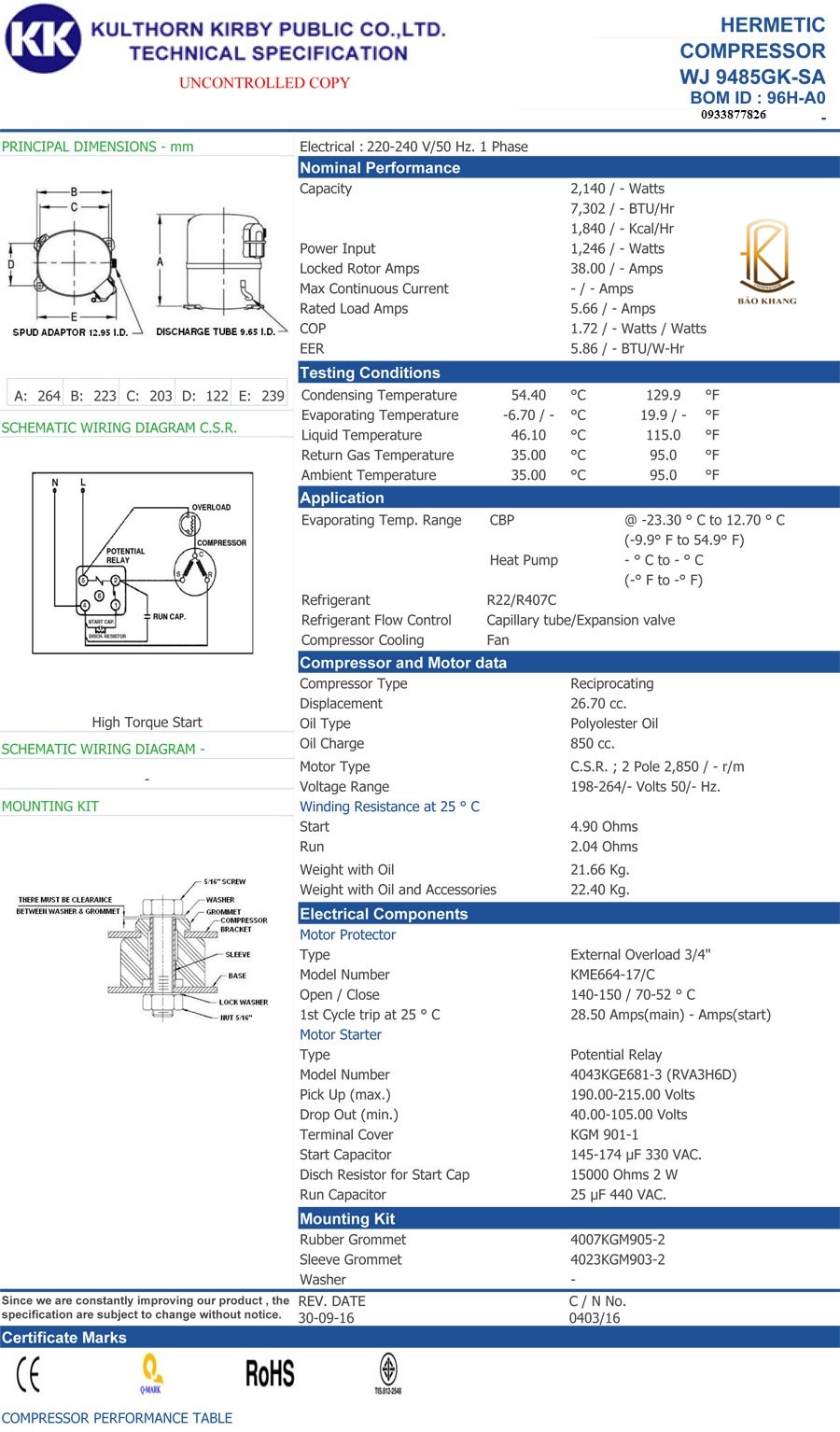 Tên sản phẩm: Máy nén Kulthorn WJ9485GK-SA Công suất: 1.3hp Điện nguồn: 220-240/1P/50Hz Môi chất lạnh: Gas R22/407