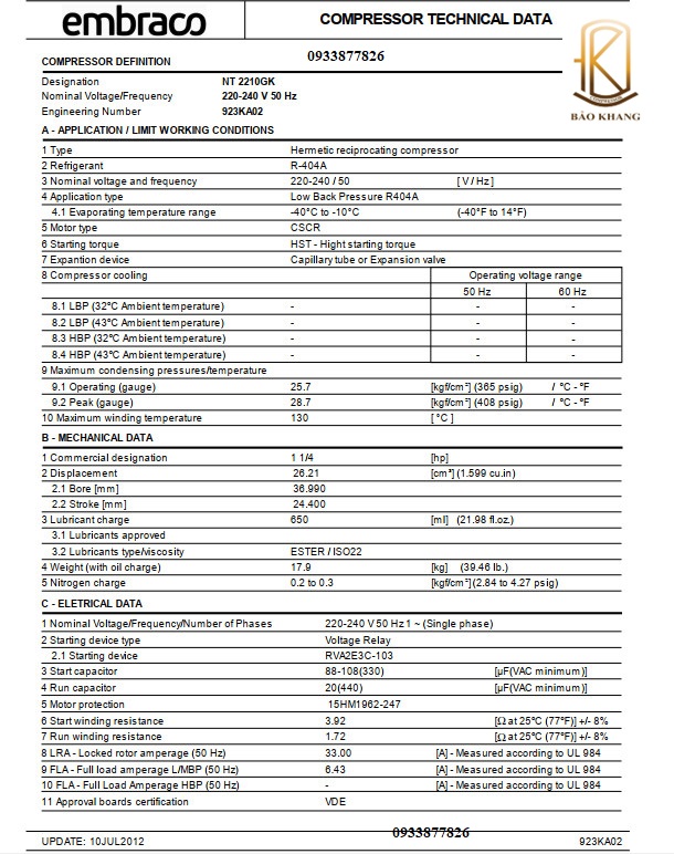 Tên sản phẩm: Model NT2210GK Công suất điện (HP): 1 1/4 HP Môi chất lạnh: R404A Cấp độ lạnh: LBP Nguồn điện: Xuất xứ: Brazil