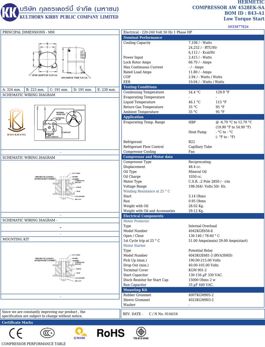Tên sản phẩm: Máy nén Kulthorn Model: AW4528EK-SA ; Công suất: 2,43HP; Điện áp: 220V/50HZ; Gas: R22; Xuất xứ: Thái Lan
