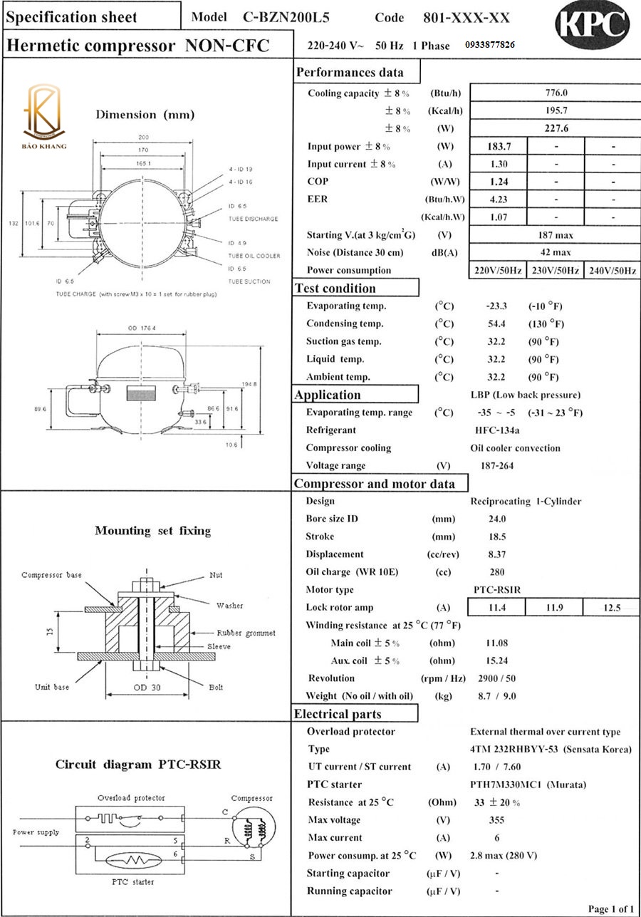 Tên sản phẩm: Máy nén Kulthorn Model: C-BZN200L5Y ; Công suất: 1/4HP; Điện áp: 380V-420V/50HZ; Gas: R134; Xuất xứ: Thái Lan