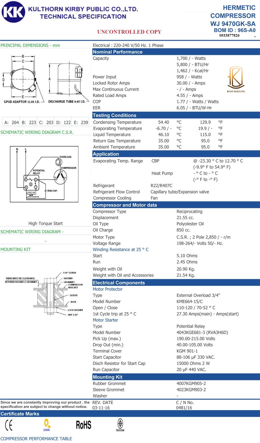 Tên sản phẩm: Máy nén Kulthorn WJ9470GK-SA Công suất: 1.hp Điện nguồn: 220-240/1P/50Hz Môi chất lạnh: Gas R22/407C