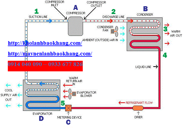 Từ A-D bao gồm nhiều thiết bị khác nhau trong hệ thống lạnh. Số 1–5 chỉ ra nhiều trạng thái vật lý của dòng môi chất lạnh di chuyển trong hệ thống: